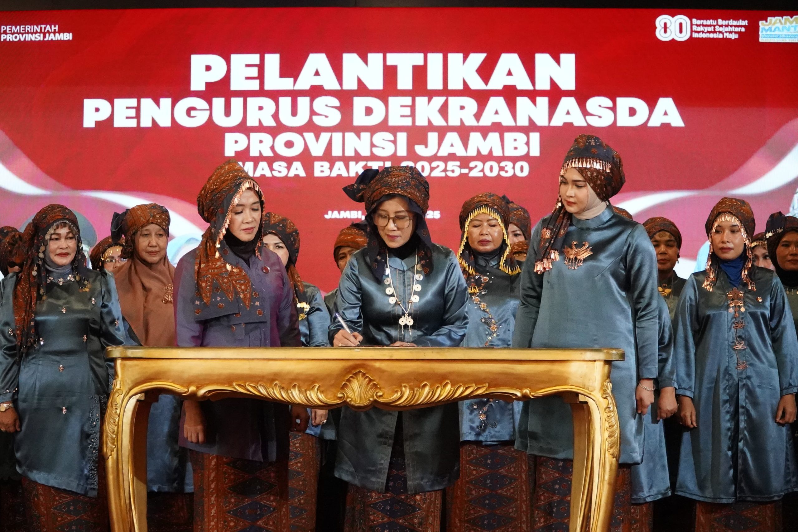 Jambi, otodanews.com – Ketua Dewan Kerajinan Nasional Daerah (Dekranasda) Provinsi Jambi Hj. Hesnidar Haris, SE melantik kepengurusan Dekranasda untuk masa bakti tahun 2025-2030 dan selaku Bunda PAUD Provinsi Jambi Hj. Hesnidar Haris juga melantik Kelompok Kerja (Pokja) Bunda PAUD Provinsi Jambi untuk masa bakti 2025-2030, bertempat di Auditorium Rumah Dinas Gubernur Jambi, Selasa (29/07/2025). Selain itu dalam kegiatan ini juga diselenggarakan Sosialisasi Dukungan Orang Tua Terhadap 7 Kebiasaan Anak Indonesia Hebat.